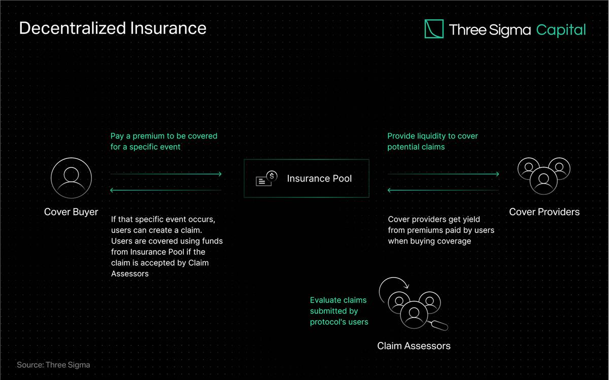 保险提供者将其资金投资于提供更高回报的池中,以比较协议的风险。这意味着个人根据其对潜在风险发生概率的估计交易事件结果。如果保险公司覆盖的协议遭受负面事件,如黑客攻击,则涵盖该协议的资金池中的资金会补偿购买针对该特定事件的保险的用户。