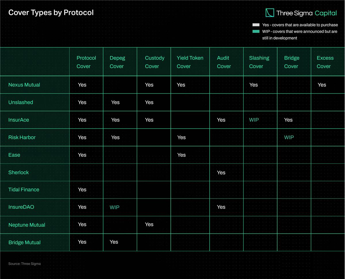 随着去中心化保险行业的发展,各种保险协议涌现出来,提供不同类型的保险覆盖。为了帮助读者了解可用的各种保险覆盖范围,我们准备了一张比较表,详细列出了现有保险协议提供的不同保险类型。