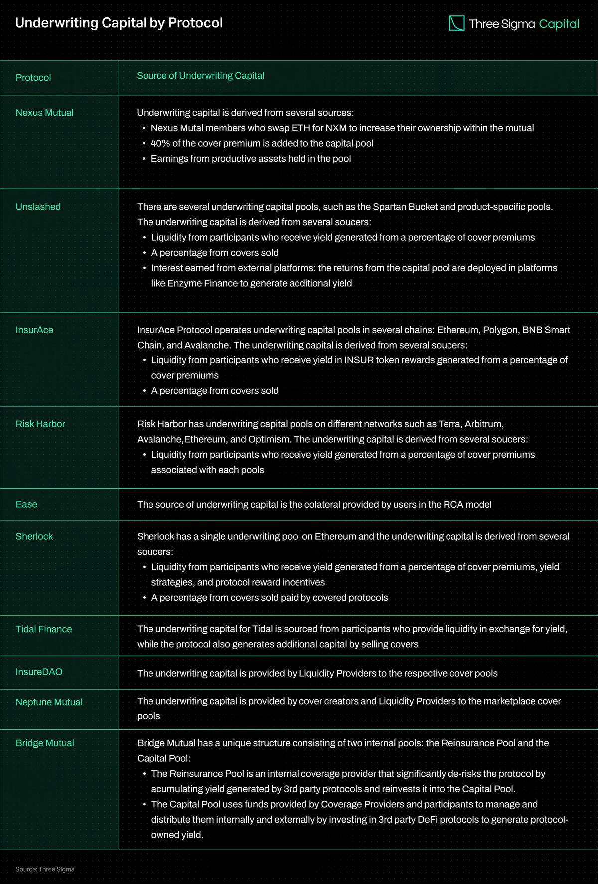 拥有更多的承保资本,协议可以提供更多的保险覆盖,从而更具吸引力。然而,承保资本的可能会影响协议的长期可持续性和有效性。例如,许多协议正在将其资本池分散到多个链上,会分散流动性,并可能影响它们在规模上的资本效率。