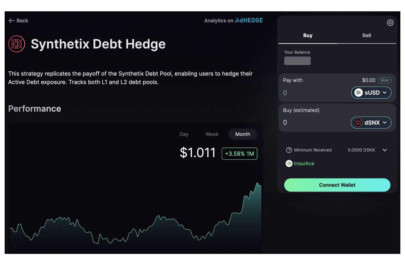 然而,现在有可能完全对冲你在 Optimism L2 上的债务头寸,这要感谢 dHedge 和他们分拆出来的 Toros。Toros 允许你用你铸造的 sUSD 购买 dSNX,这样你就不会受到市场波动的影响,你的债务也不会随着时间推移而增加。