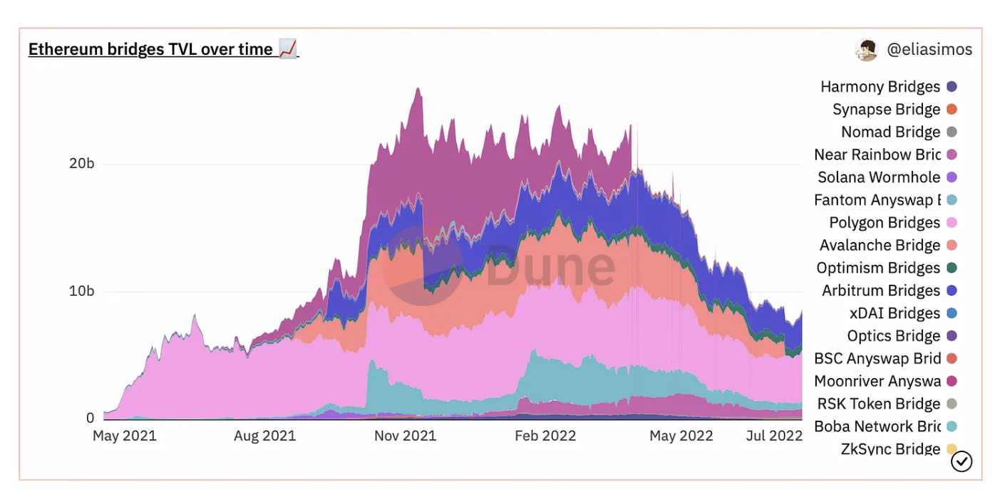 跨链桥市场前景巨大,目前的 TVL 为 87 亿美元,峰值时则能达到 240 亿美元。通过推出各种工具,Synthetix 将很快在这一市场中占据一定的份额。