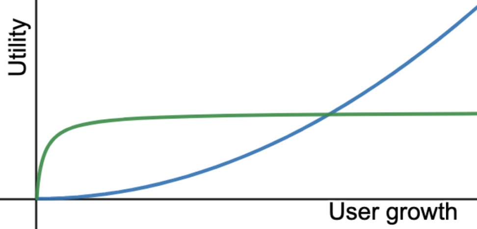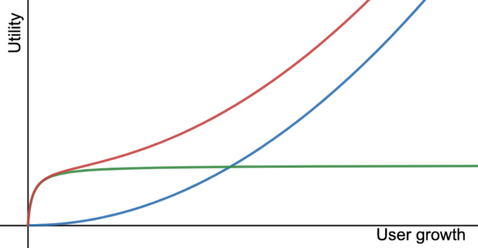 许多 Web3 游戏不具有网络效应,或者只有上图绿线所示。绿线表示趋同网络效应。这种效应最初会产生明显的效用增长,但很快会减弱到某个值。例如,增加一个地区的用户数量可以减少匹配所需的时间。从 10 秒减少到 1 秒的效用增长是很明显的,但是从 1 秒减少到 0.1 秒不会导致效用的大幅增加。产品的价值取决于其效用的上限。