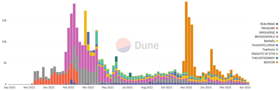 如上图所示,TreasureDAO 的生态系统在「一代币多游戏结构」方面显示出了良好的潜力,但新游戏带来的 DAU(日活跃用户)流入仅足以弥补旧游戏用户的减少,无法保证自我增长,这意味着该生态系统尚未完全实现自我持续发展。