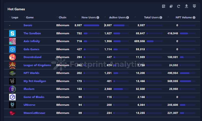 以太坊上的区块链游戏 Sorare 吸引了广泛的关注,并在用户参与度方面成为领先者。上个月,Sorare 拥有 3,037 名活跃用户,取得了引人注目的成绩,超过了 The Sandbox 和 Axie Infinity 在用户数量上的表现。