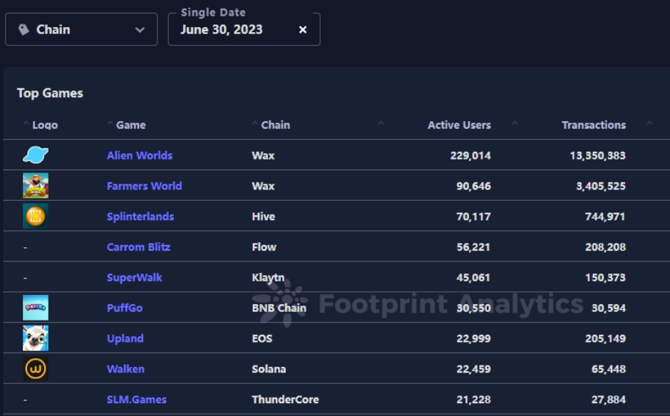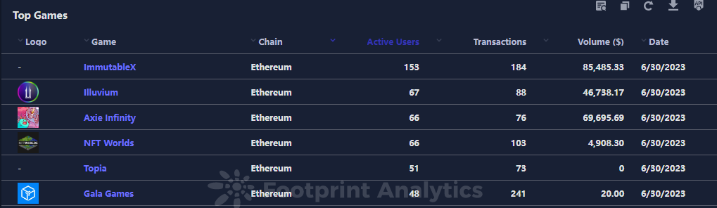 虽然 6 月市场上有大约 1,021 款活跃的游戏(用户在当月与游戏合约有所交互的游戏),但数据显示,仅有 19 款游戏的日活跃用户超过了 1 万。即使是像 Axie Infinity 这样的知名游戏,6 月 30 日的日活跃用户数也只有 8,569 人。
