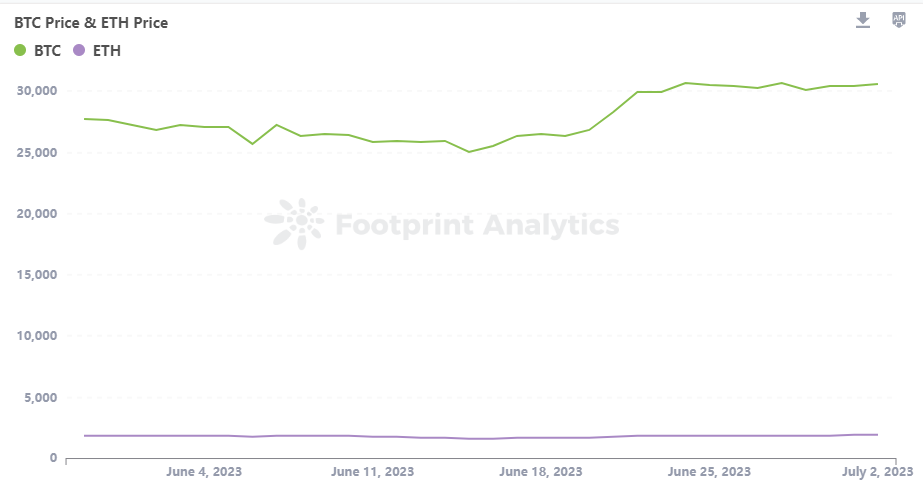 2023 年 6 月,比特币经历了起起伏伏,6 月 22 日更是达到了 12 个月的最高点 31,200 美元。在波动的加密市场中,比特币币价保持了持续的上升趋势。