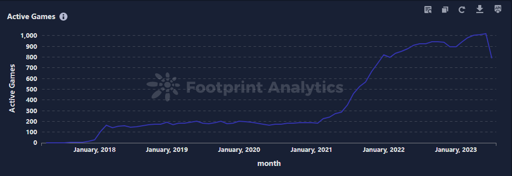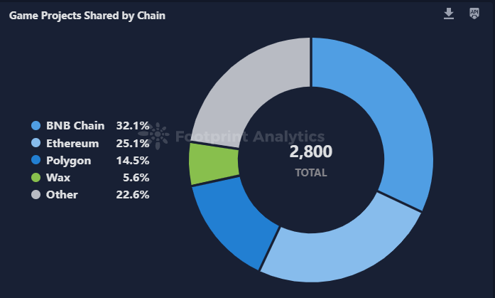 各公链上的游戏数量分布维持相对平稳,没有某条链占据绝对主导地位的情况出现。BNB 链上承载的游戏项目最多,其次是以太坊和 Polygon,它们三者合共占据了市场 71% 的游戏项目比例。