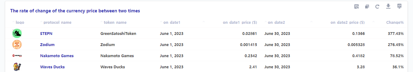 六月份,StepN 的代币价格以 377.43% 的涨幅居首,紧随其后的是 Zodium 和 Nakamoto Games,它们的代币价格也表现出显著的增长。