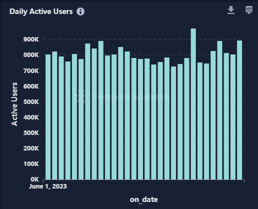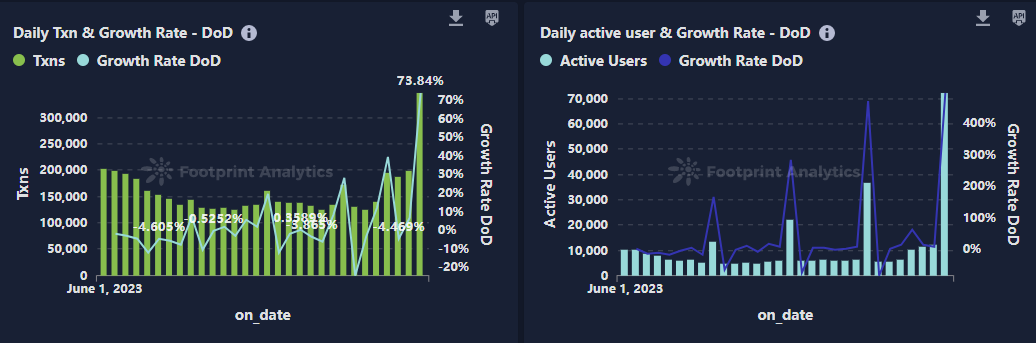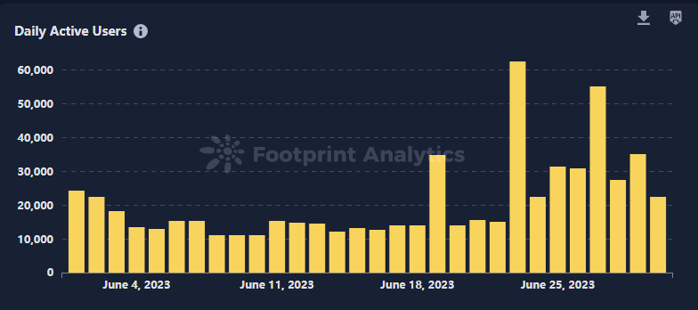 本月区块链游戏的日活用户在 70 万到 100 万之间波动。然而,在 6 月 23 日,活跃用户数量上涨到了 16.6 万,其中 Walken 相较前一天增加了 47,459 名用户,对此次增长贡献显著。这一数据激增反映了加密货币游戏用户基础相对较小,单个游戏的增长就可以影响整体市场的数据。