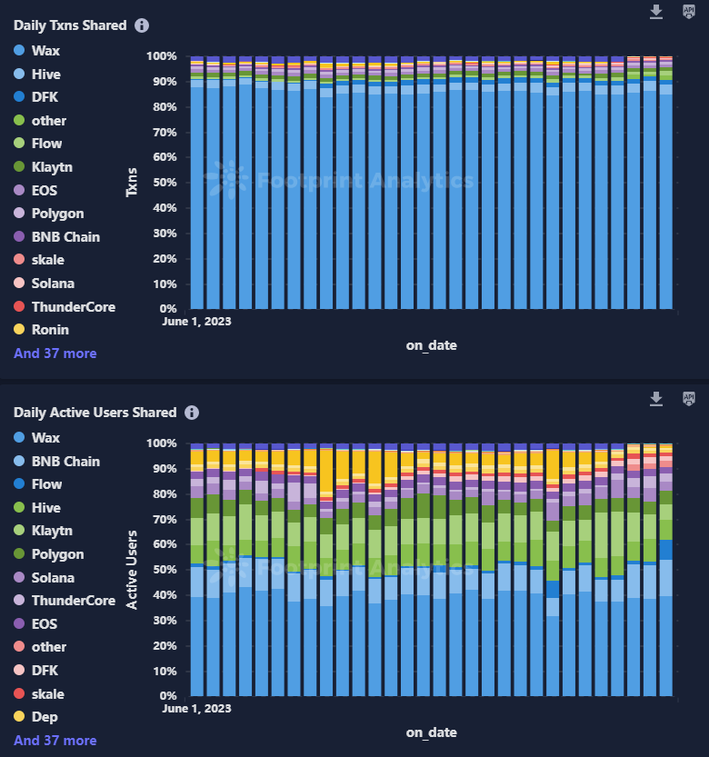 新推出的大部分区块链游戏通常选择在三大公链——BNB 链、以太坊和 Polygon 上发布。然而,从活跃用户和交易数量来看,WAX 链占据了领先地位,其交易量约占全体的 85%,活跃用户则占 35%。尽管 WAX 链拥有庞大的用户基数和交易次数,但在总交易额中的份额却相对较小。这一现象揭示了 WAX 链独特的技术架构特性,使得用户在 WAX 链上需要进行的交易次数较多。