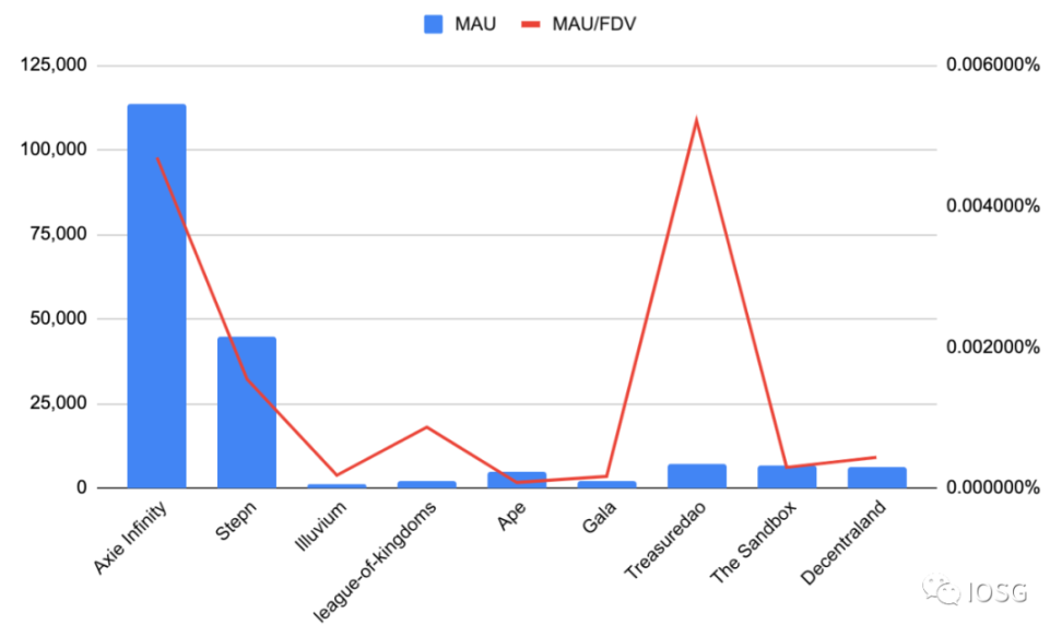 随着 Beacon 在上个月大火并为 Treasure 聚集了近 3 万名活跃用户,相比 Sandbox、Decentraland、Otherside、Gala 等其他平台,我们估算 TreasureDAO 的价值在被低估。我们通过分析 MAU/FDV 比率得出此结论,该比率引入月活用户来代表其活跃程度。