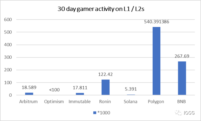 最近 30 天玩家在不同 L1 和 L2 上的活动表明大部分活动仍在 Polygon 和 BNB 上;但 Arbitrum 是 ETH L2 和 L3 中的领导者。TreasureDAO 贡献了 Arbitrum 上约 76% 的游戏活动。