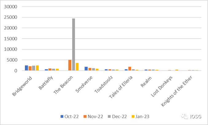 目前已上线的游戏中,最受欢迎的(按 MAU 计算)是 The Beacon、Bridgeworld、Battlefly 和 Smolverse。