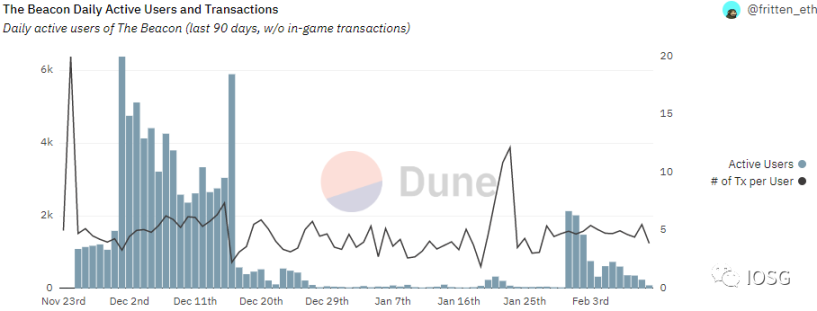 The Beacon 实际上是 Treasureverse 中的第一个具备可玩性的游戏。这是一款类 rogue-like 动作角色扮演游戏,为 TreasureDAO 赢得了很大的注意力。The Beacon 上线前,Treasure 的最高周活跃用户仅录得不到 1 万。而 The Beacon 就有近 3 万的总用户,几乎是之前 Treasure 用户数量的 3 倍。不仅如此,The Beacon 还为 Trove 贡献了超过 600 万美元的交易量。