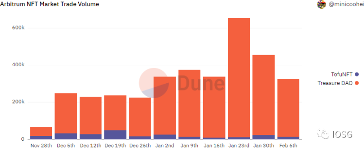 Trove Marketplace 于 2022 年 6 月正式启动。它从 2021 年 11 月推出的 Treasure Marketplace 演变而来,最初的想法是为 Treasure 上的生态项目提供 NFT 的交易市场。自推出以来,该市场的总交易额已超过 2.67 亿美元。如下图所示,它也是 Arbitrum 上领先的 NFT 交易市场。