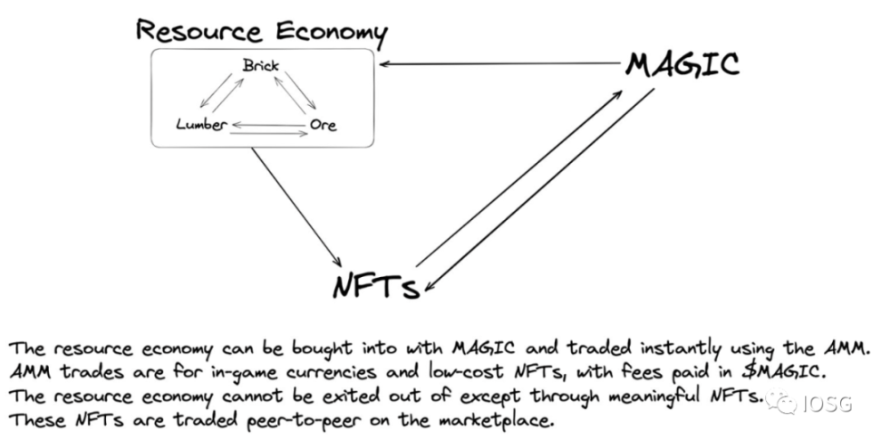 代币整体上参考了 BTC 的通缩机制,设置了最大供应量为 3.5 亿枚,且每年减半。早在 Treasure 建立初期,创始人就在一篇文章中透露出对流动性和代币经济的重视,并将 $MAGIC 设想为一种类似 ETH 的资源代币,而不是毫无实际用例的治理代币。不仅如此,$MAGIC 需要被质押才能获得生态收益。但创新在于将 Treasure 等 NFT 也当成底层资产,并设计出双资源经济模型。用户必须同时抵押这两种 NFT 和 $MAGIC,才能获得新物品,这也是早期 Bridgeworld 的雏形。