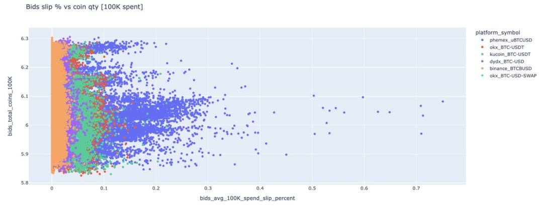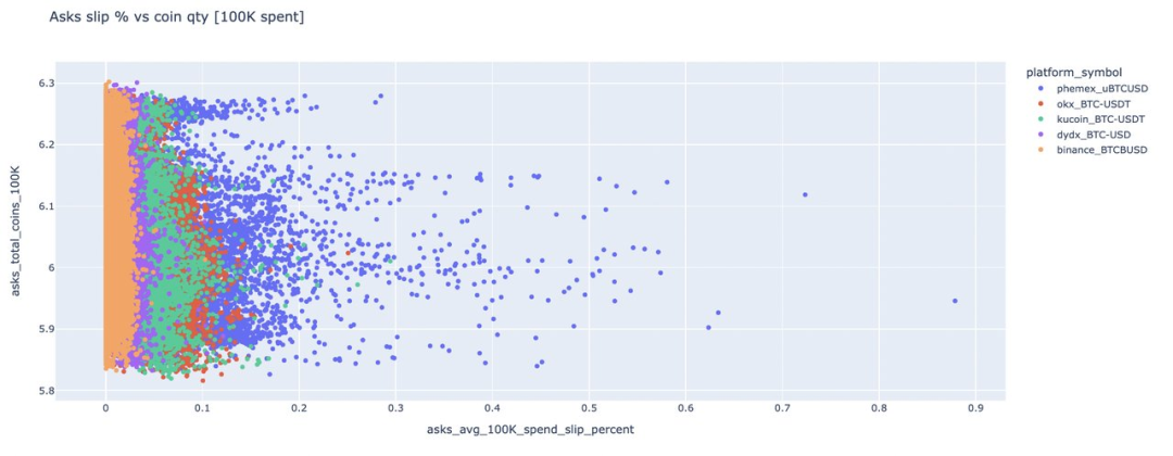 总的来说,Binance 和 dYdX 似乎有非常好的深度和价格。KuCoin 和 OKX 紧随其后,而 Phemex 有着最大的滑点。