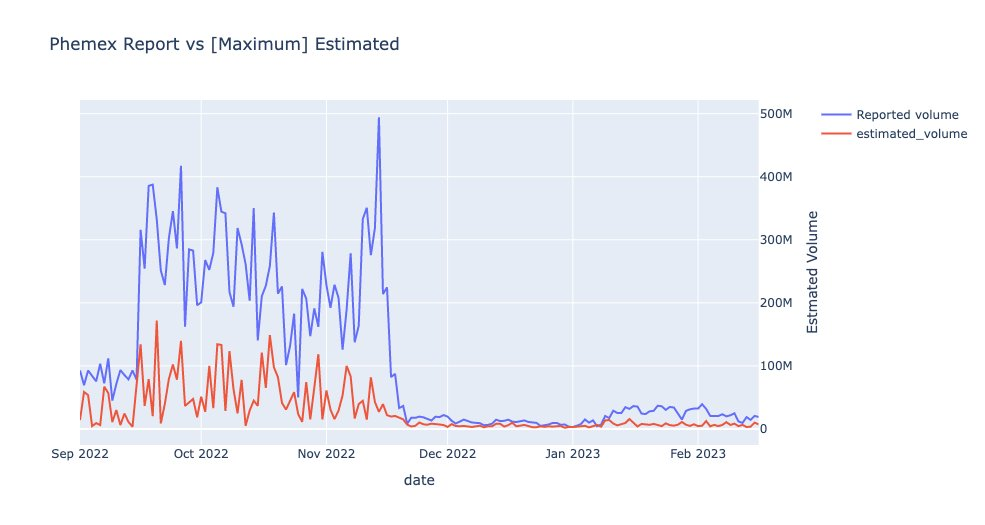 对一些飙升的交易量进行比率分析估计,估计的交易量占 Phemex 报告交易量约 5%~25%。