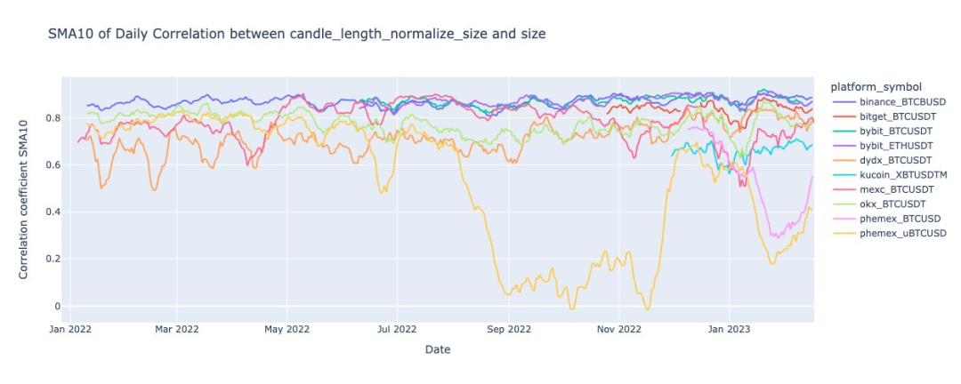 观察到 Phemex 的价格波动和交易量之间的相关性很弱,我们假设交易所的虚假交易主要发生在价格小幅波动的时期。也就是说,价格大幅波动期间的交易量是真实的。这是一个保守的假设,用于估计虚假交易量的比例。