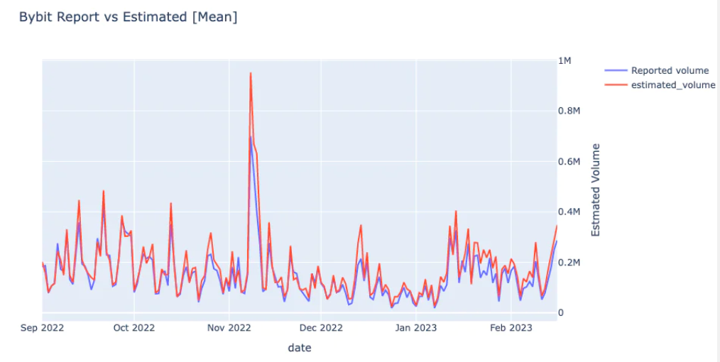 使用相同的方法来估计 Binance 和 Bybit 的真实交易量比,结果与报告的交易量非常接近。