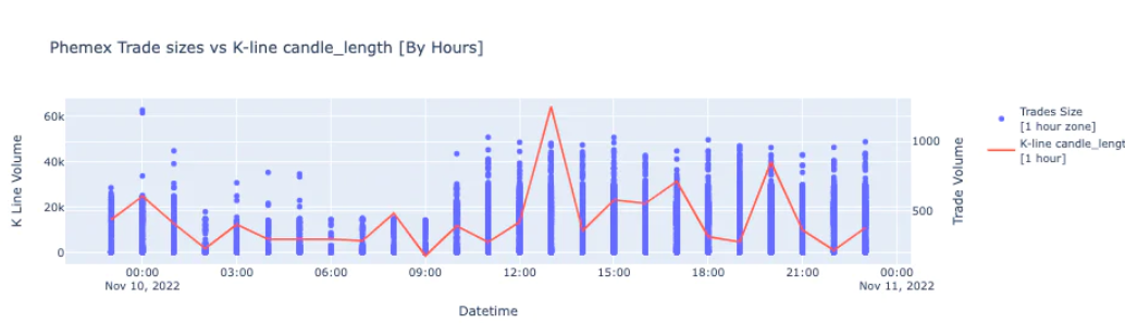 而在 Phemex 交易所中,我们没有从原始交易订单流和 k 线交易量中发掘明显相关性,交易订单的规模没有显示出随机性。与 Binance 相比,交易规模相对停滞。变化的是交易的密度,而不是单个交易规模。