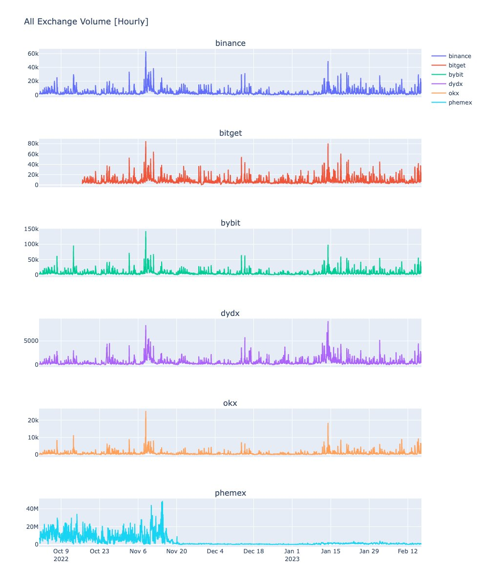 通过下图我们可以得知,自 2023 年以来,加密货币交易所的交易量大幅增加;不过 Phemex 交易所的交易量形态呈现异常。