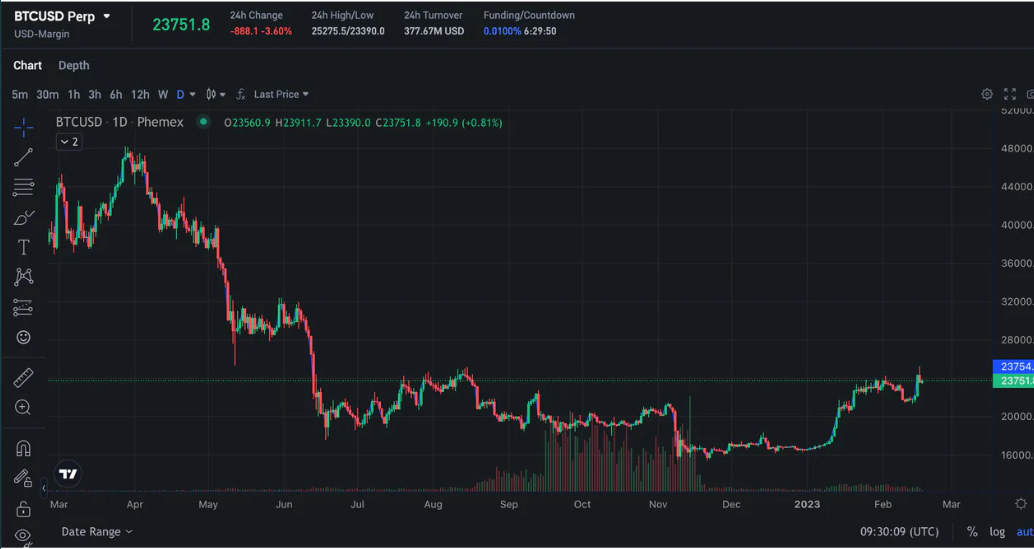 下图显示了 Phemex 的 uBTCUSD 交易对的价格和交易量图。可以清楚地看到,从 2022 年 8 月 19 日开始,交易量迅速增加,从 2022 年 9 月 16 日开始到 2022 年 11 月 19 日,这种疯狂的交易量再度上演。此后,在没有任何迹象的情况下,交易量急剧下降,并将水平降至 2022 年 8 月 19 日之前的交易量。从 2023 年 1 月开始,成交量似乎再次反弹,并继续保持在一个较高的水平。