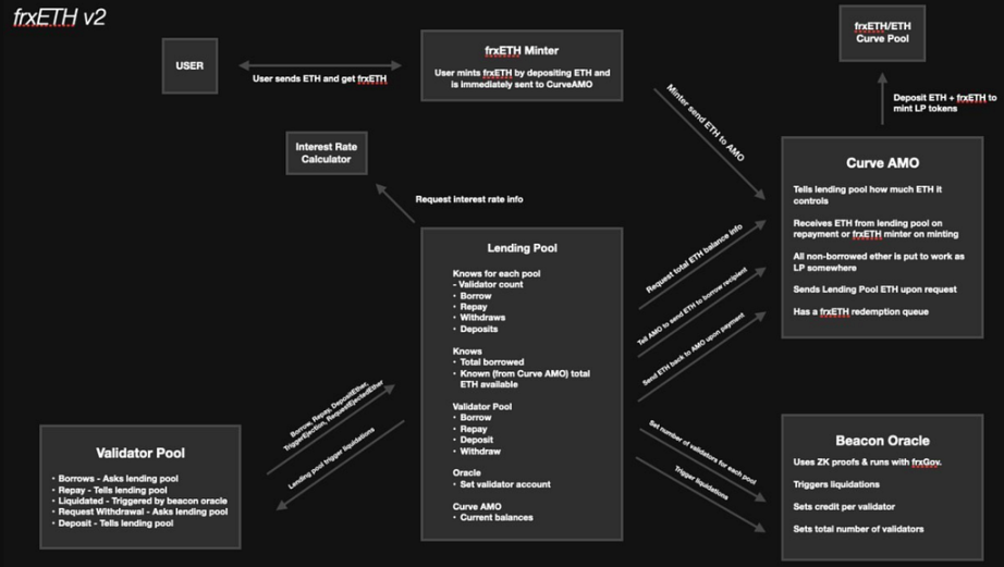 1、在 Rocket Pool 中用户存入的 ETH 会被累积在存款池,在激活验证之前无法产生收益,这将会拖累 r ETH 的整体收益率,目前该存款池存在上限为 1.8 万枚 ETH ;而在 frx ETH V2 的设计中,用户存款首先会分配给 Curve AMO ,当节点需要用户端 ETH 配对之时再由 Curve AMO 分配给 Lending Pool 。如此一来由于闲置的 ETH 可以在 Curve AMO 中赚取交易手续费与挖矿奖励,其相较于 Rocket Pool 的整体收益就会提高。
