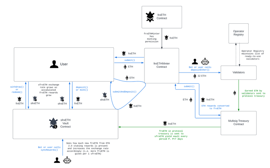 在 Frax protocol 未来将要推出的 frxETH V2 版本中,团队将致力于保证高年化收益的同时解决中心化的问题。 frxETH V2 的的整体设计逻辑与 Rocket Pool 类似,但是又有 Frax 自身的特殊之处,关键区别在于: