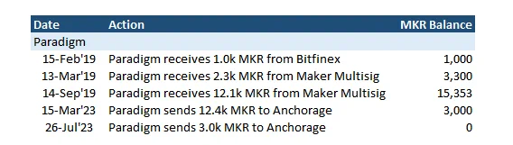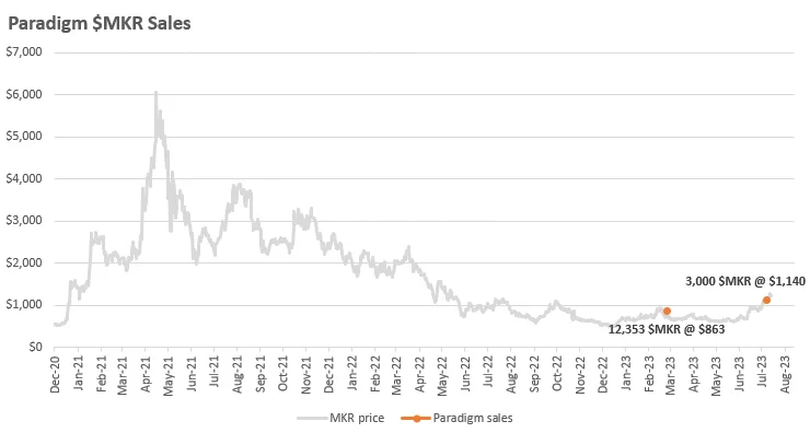 Paradigm 是这三家 VC 中最晚开始抛售的,从 2023 年 3 月开始,以 800 美元以上的价格出售了其持有的 80% MKR 代币。剩下的最近以约 1,100 美元的价格出售。