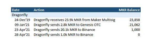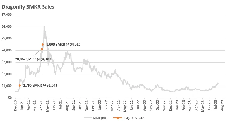 Dragonfly 是第一个开始在 2021 年 1 月出售其代币的,但大部分销售发生在 2021 年 4 月,当时 MKR 接近其 6,000 美元的高点。