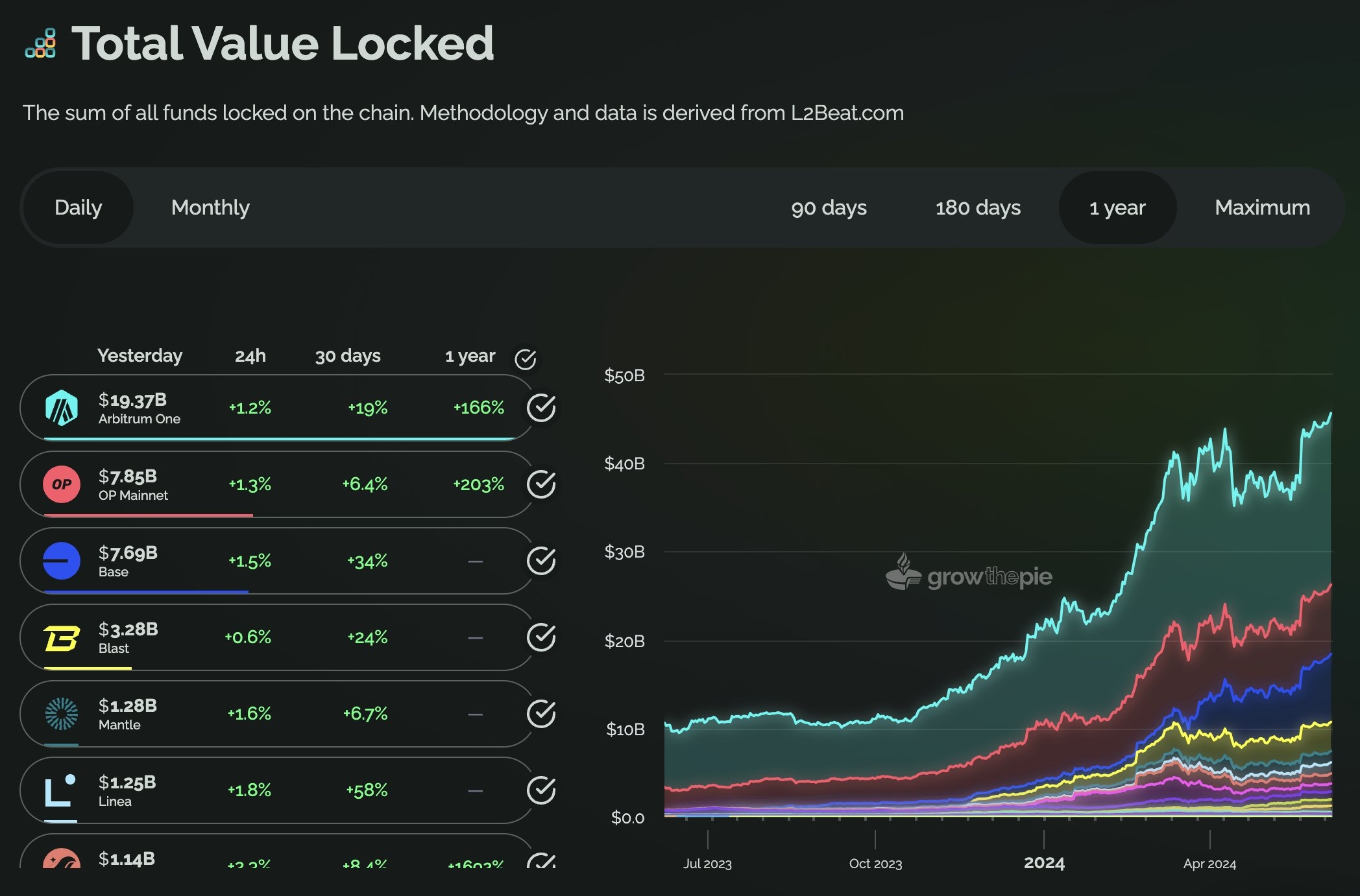 萌币网 消息,据 growthepie 数据显示,以太坊 L2 总 TVL 已升至 450 亿美元,创历史新高。