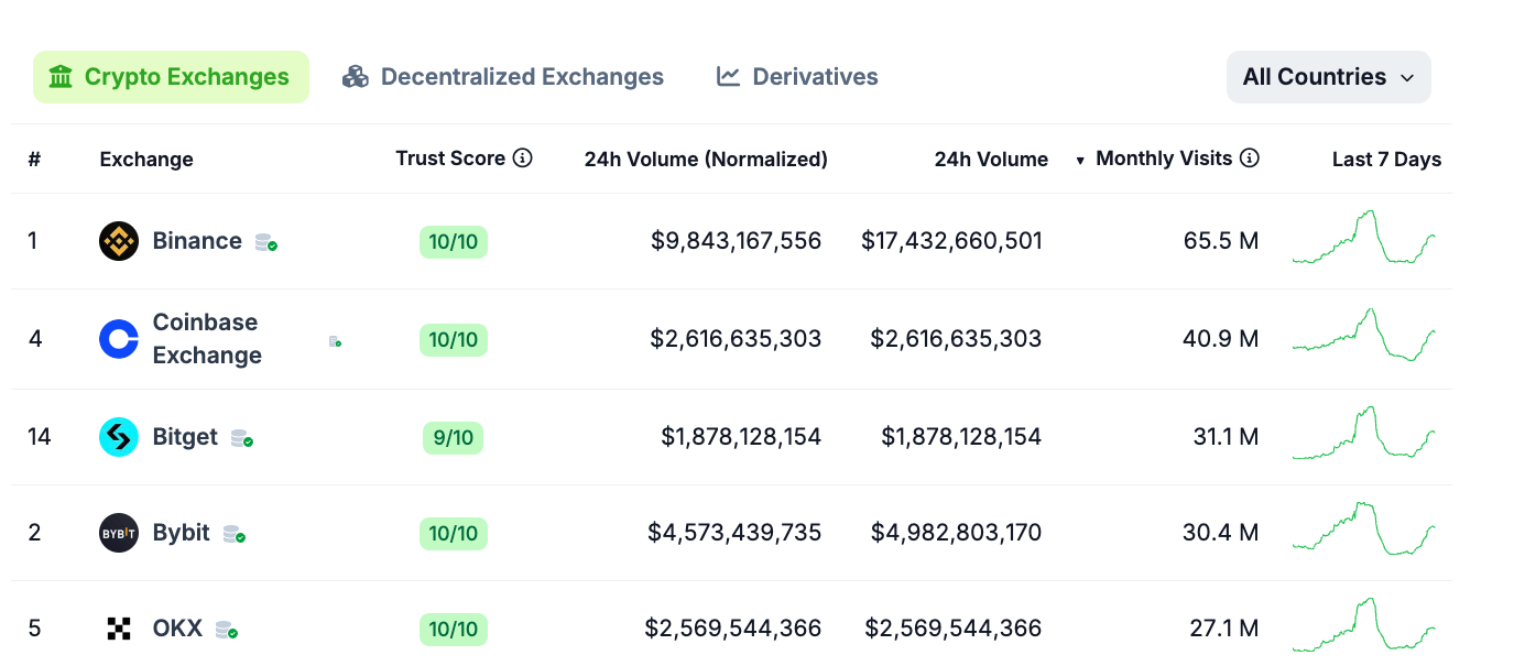 萌币网 消息,据 CoinGecko 数据显示,月访问量交易所排名中,币安以 6550 万次访问量位列第一,Coinbase 以 4090 万次位列第二,Bitget 以 3110 万次位列第三,Bybit 以 3040 万次位列第四,OKX 以 2710 万次位列第五。