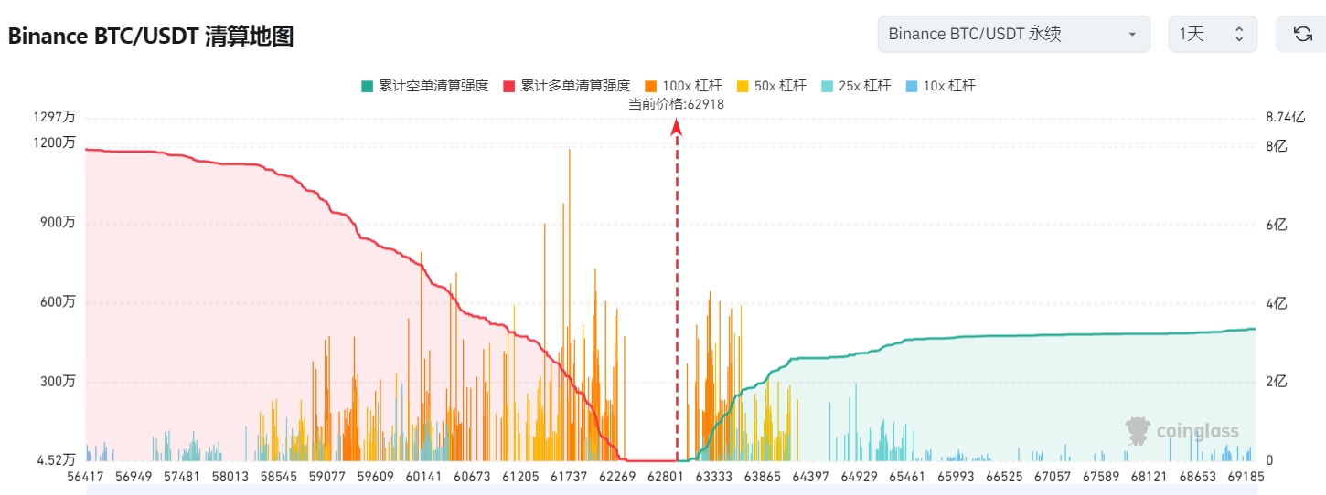 萌币网 消息,据 Coingalss 数据,按当前主流 CEX 合约持仓情况,若比特币回升突破 6.5 万美元,预计将有 7.32 亿美元空单清算。若比特币跌至 6.1 万美元附近,预计将有 9.42 亿美元多单清算。