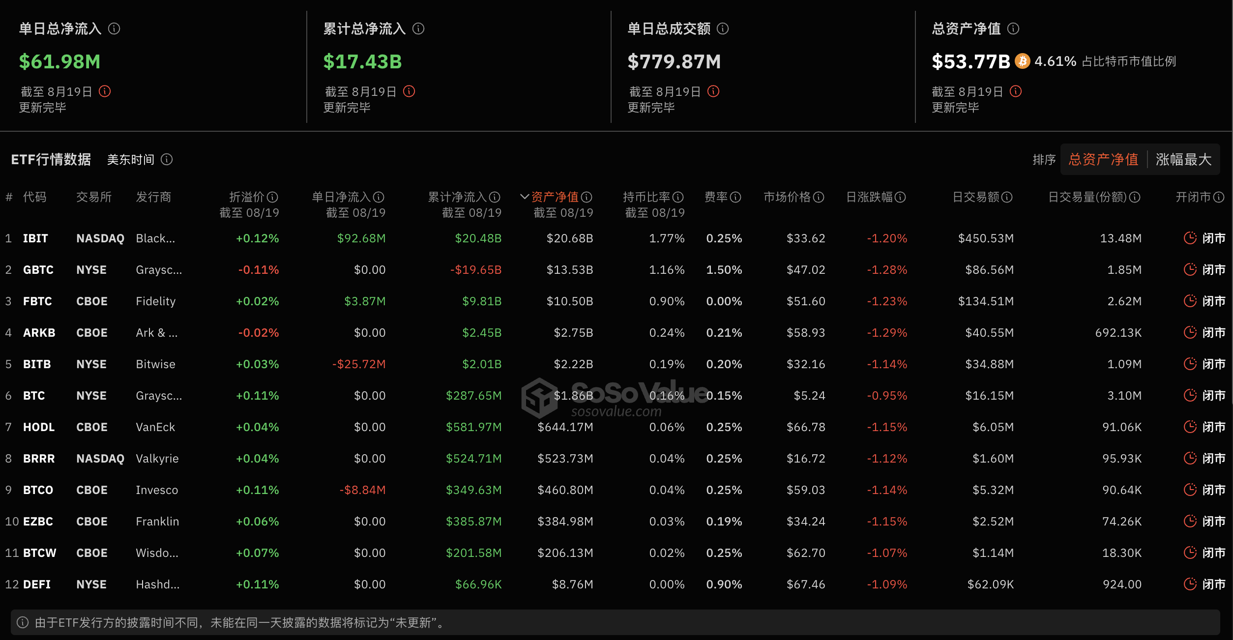 萌币网 消息,根据 SoSoValue 数据,昨日(美东时间 8 月 19 日)比特币现货 ETF 总净流入 6198.03 万美元。昨日灰度(Grayscale)ETF GBTC 单日净流出 0.00 美元,目前 GBTC 历史净流出为 196.46 亿美元。灰度(Grayscale)比特币迷你信托 ETF BTC 单日净流出 0.00 美元,目前灰度比特币迷你信托 BTC 历史总净流入为 2.88 亿美元。