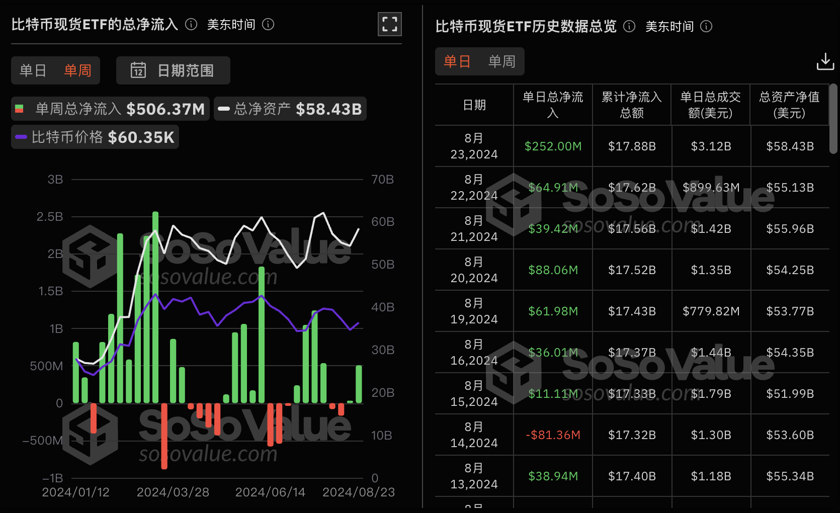 萌币网 消息,据 SoSoValue 数据,上周交易日比特币现货 ETF 8 月 19 日至 8 月 23 日单周净流入 5.06 亿美元。其中灰度(Grayscale)ETF GBTC 周净流出 8654 万美元,目前 GBTC 历史净流出为 197.3 亿美元。上周单周净流入最多的比特币现货 ETF 为贝莱德(BlackRock)ETF IBIT,周度净流入为 3.18 亿美元,目前 IBIT 历史总净流入达 207.1 亿美元。其次为 Fidelity ETF FBTC,周度净流入为 8779 万美元,目前 FBTC 历史总净流入达 98.9 亿美元。