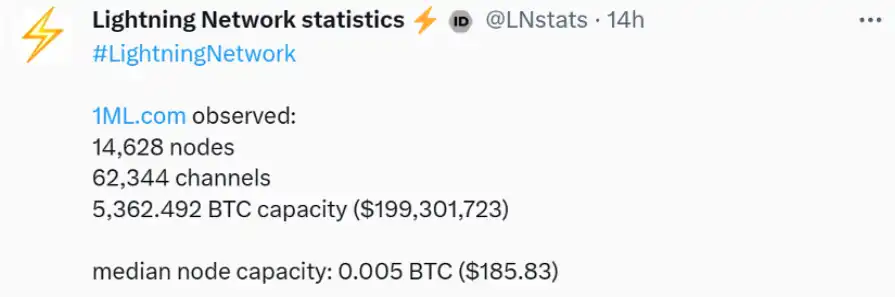 目前,闪电网络拥有超过 14,000 个节点、60,000 个通道和总容量超过 5000 BTC。