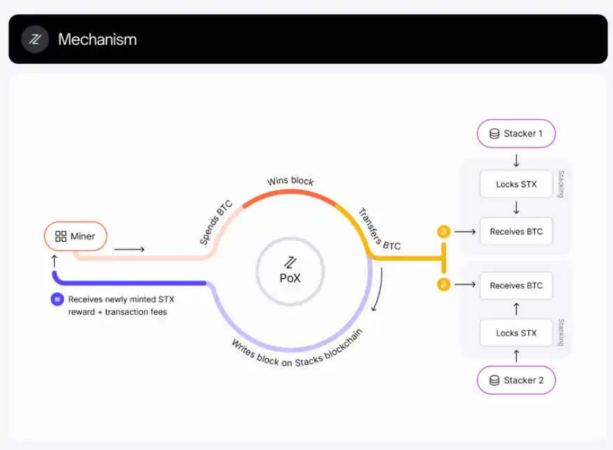 Stacks 通过转移证明(PoX)的双螺旋机制实现共识。矿工将 BTC 发送到 STX 持有者以争夺挖掘区块的权利,成功挖掘区块后,成功的矿工将获得 STX 奖励。在这个过程中,STX 持有者收到矿工发送的 BTC 的相应比例。Stacks 旨在通过发行本地代币来激励矿工维护历史总账,尽管在没有本地代币的情况下仍然可以实现激励(正如在 RSK 中所见)。