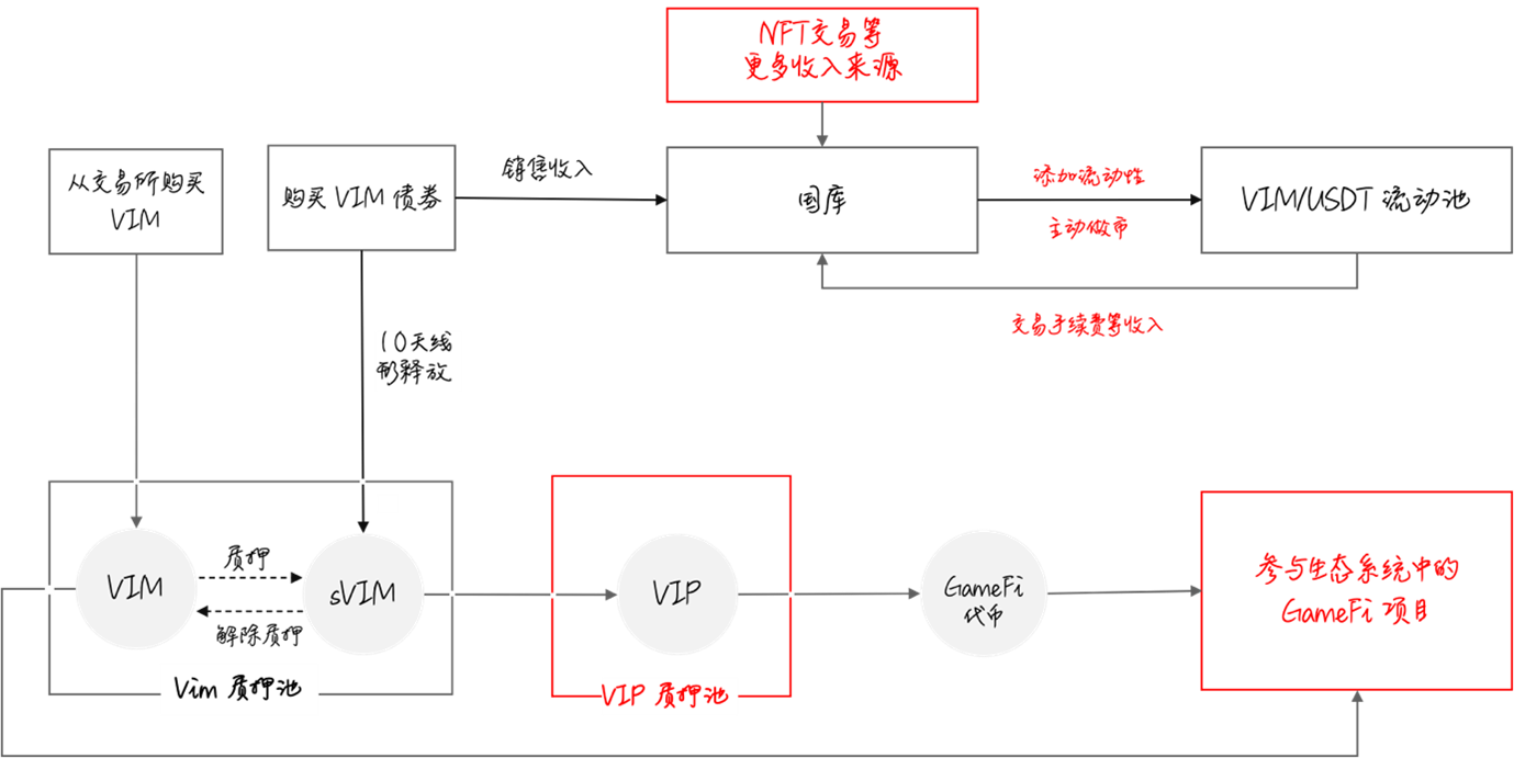 基于此, VIM 资产除了在其债权体系中发挥重要作用外, 还可以参与生态中的 GameFi 项目,获取游戏资产,享受更多收益机会和游戏体验。VIM 也可以用来购买生态系统中合作项目的债券,以获得项目折扣价的代币。通过 GameFi 系统,VIM 有了更多消耗场景,因此进一步增加了 VIM 资产的刚需性。