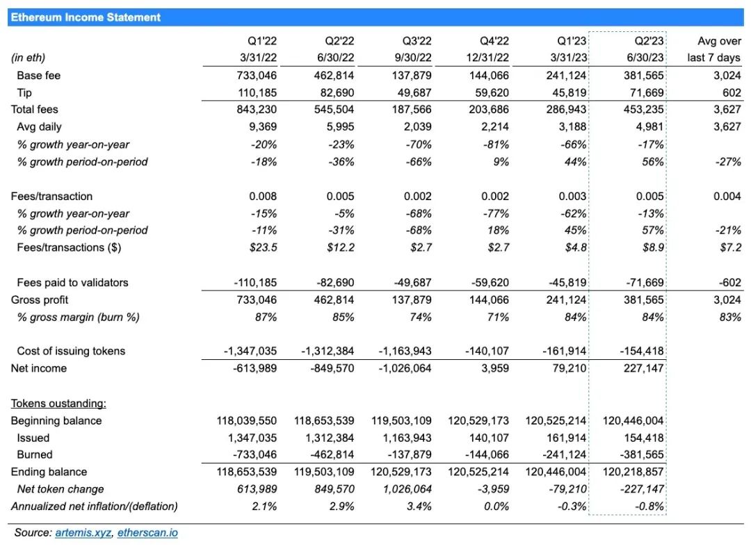从 ETH 正式引入 PoS 后开始计算,从 2022 年第四季度至 2023 年第二季度,以太坊网络的总盈利(美元)为:(3,959*1,301)+(79,210*1,589)+(227,147*1,861)= 553,735,916 美元,折合年化收益约为 738,314,555 美元;
