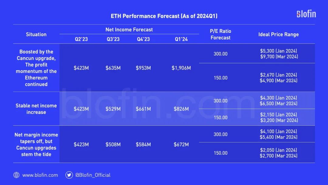 -假设 ETH 市盈率不出现显著变化,投资者的强劲预期推动市盈率维持在 300 左右。2023 年 Q2 的净收入为 4.23 亿美元,Q3 的净收入为 5.29 亿美元,Q4 的净收入为 6.61 亿美元。在此情形下,ETH 网络的 2023 年度总营收将达到 17.39 亿美元,ETH 在 2024 年年初时的均价或将突破 4,300 美元,并于 2024 年第一季度突破 6,500 美元。如果市盈率回落至 150 左右,则 ETH 在 2024 年年初均价或为 2,150 美元左右,并于 2024 年第一季度突破 3,200 美元。