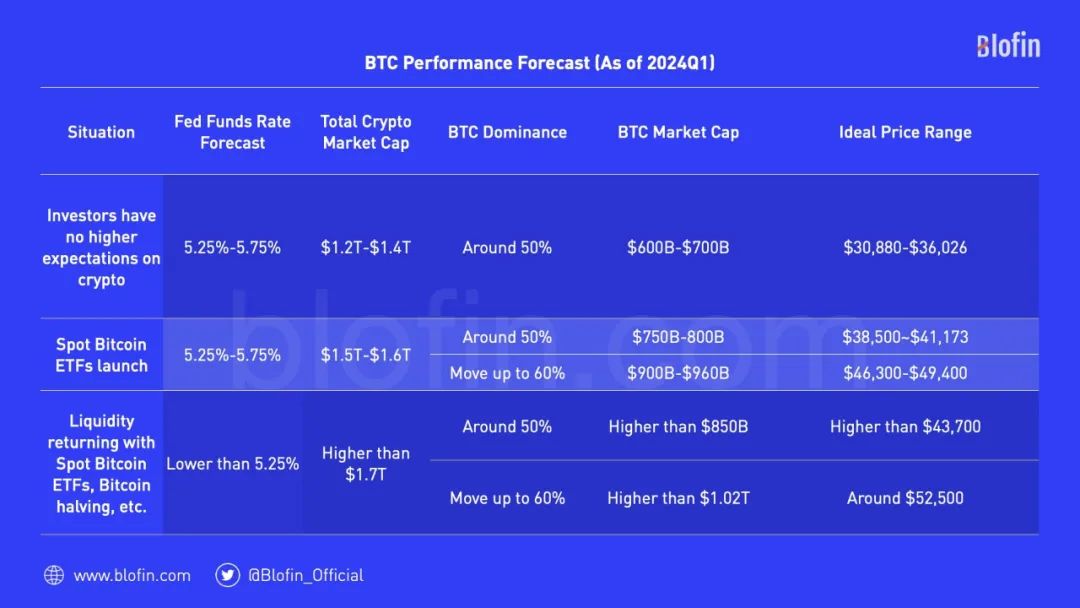 -假如现货 ETF 通过导致 BTC 市占率上升至60%。最好情况下,BTC 的市值将达到 9,600 亿美元,单价超过 49,400 美元;即使加密市场整体反弹不够剧烈,BTC 的市值也会回升至 9,000 亿美元,单价达到 46,300 美元。