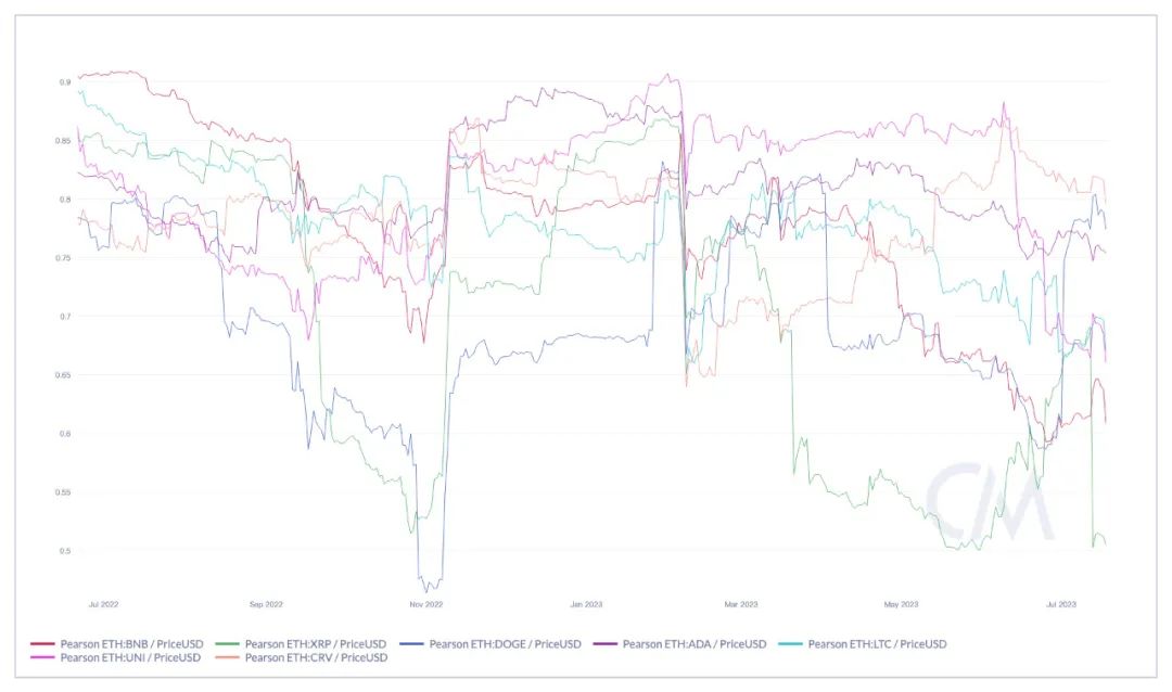 ETH 与除 BTC 外其他主要加密货币相关性变动,截至 2023 年 7 月。来源:CoinMetrics