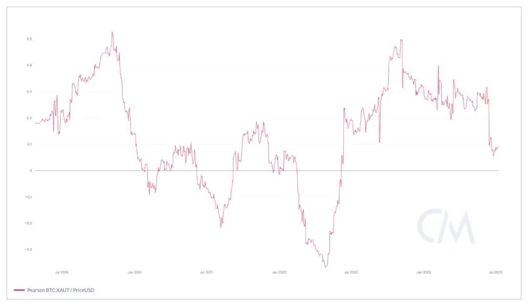 2020 年 7 月至今 BTC 与黄金 90 天价格相关性变动情况。来源:CoinMetrics