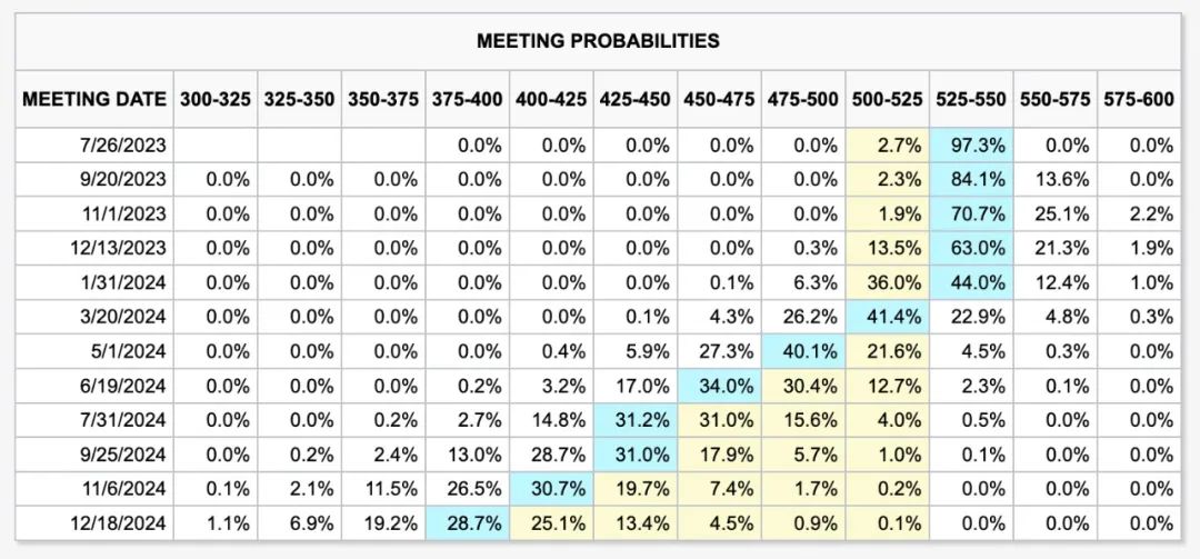 美联储最新可能利率路径,截至2023 年 7 月 17 日。来源:CME Group