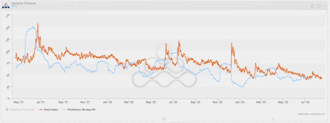 2021 年 5 月至今 BTC DVOL 波动率指数与已实现波动率水平对比。来源:Amberdata Derivatives