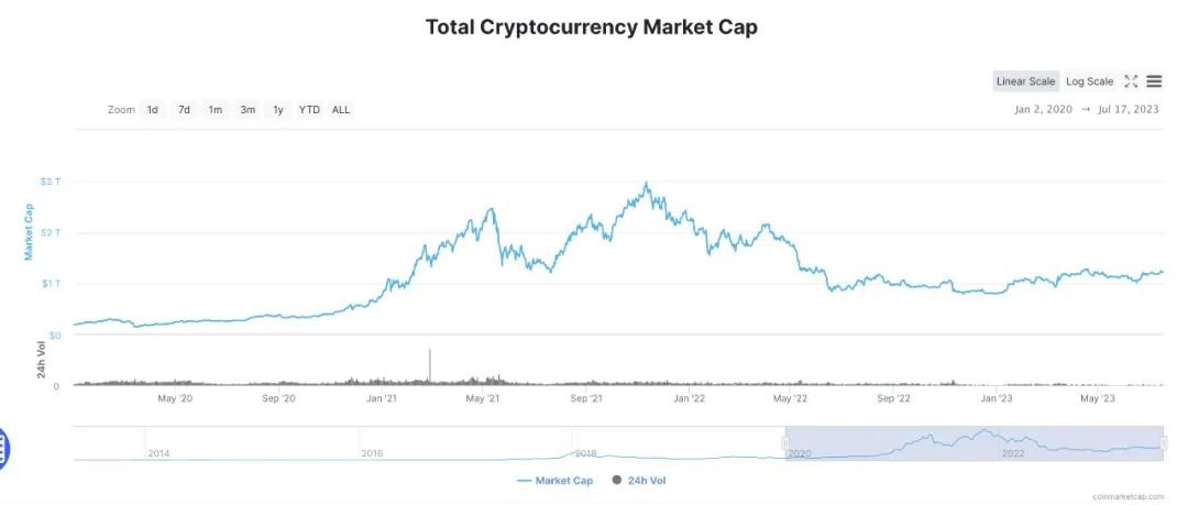 加密市场总市值变动,截至 2023 年 7 月 17 日。来源:Coinmarketcap