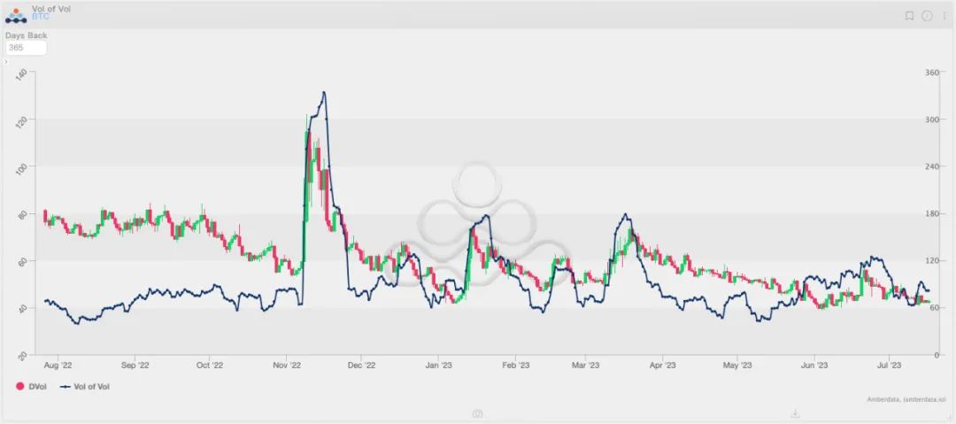 2022 年 8 月 BTC DVOL 波动率指数与“波动率的波动率”水平对比。来源:Amberdata Derivatives