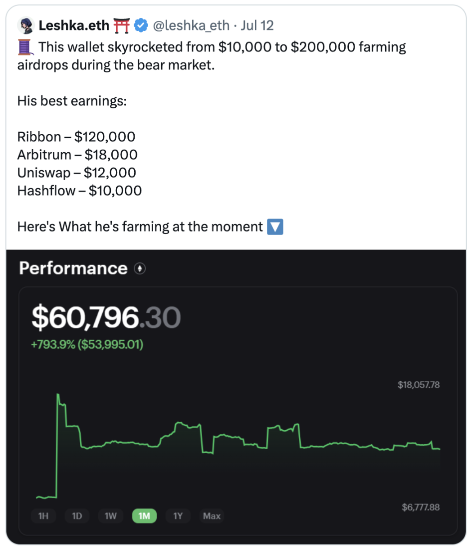 这个地址在熊市里深耕空投,钱包价值从 1 万刀涨到到 20 万刀,并且还在继续????。