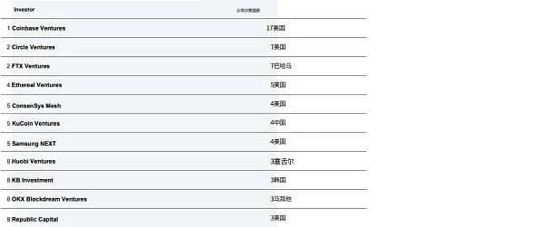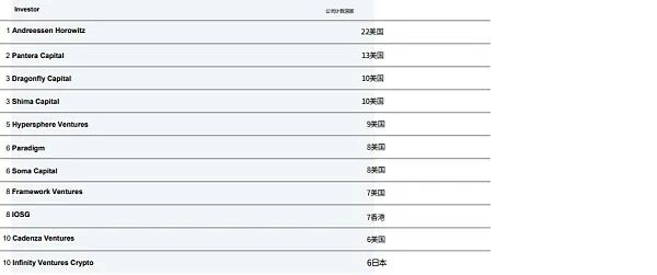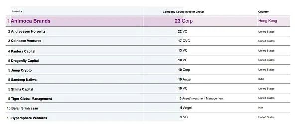 Animoca Brands 是第一大投资者。Animoca Brands 依旧是最活跃的投资者(连续三季度),尽管其投资数量也环比下降。此外,本季度,最活跃的 10 位投资者(包括 a16z 和 Coinbase)参与的投资数量减少了 24%。